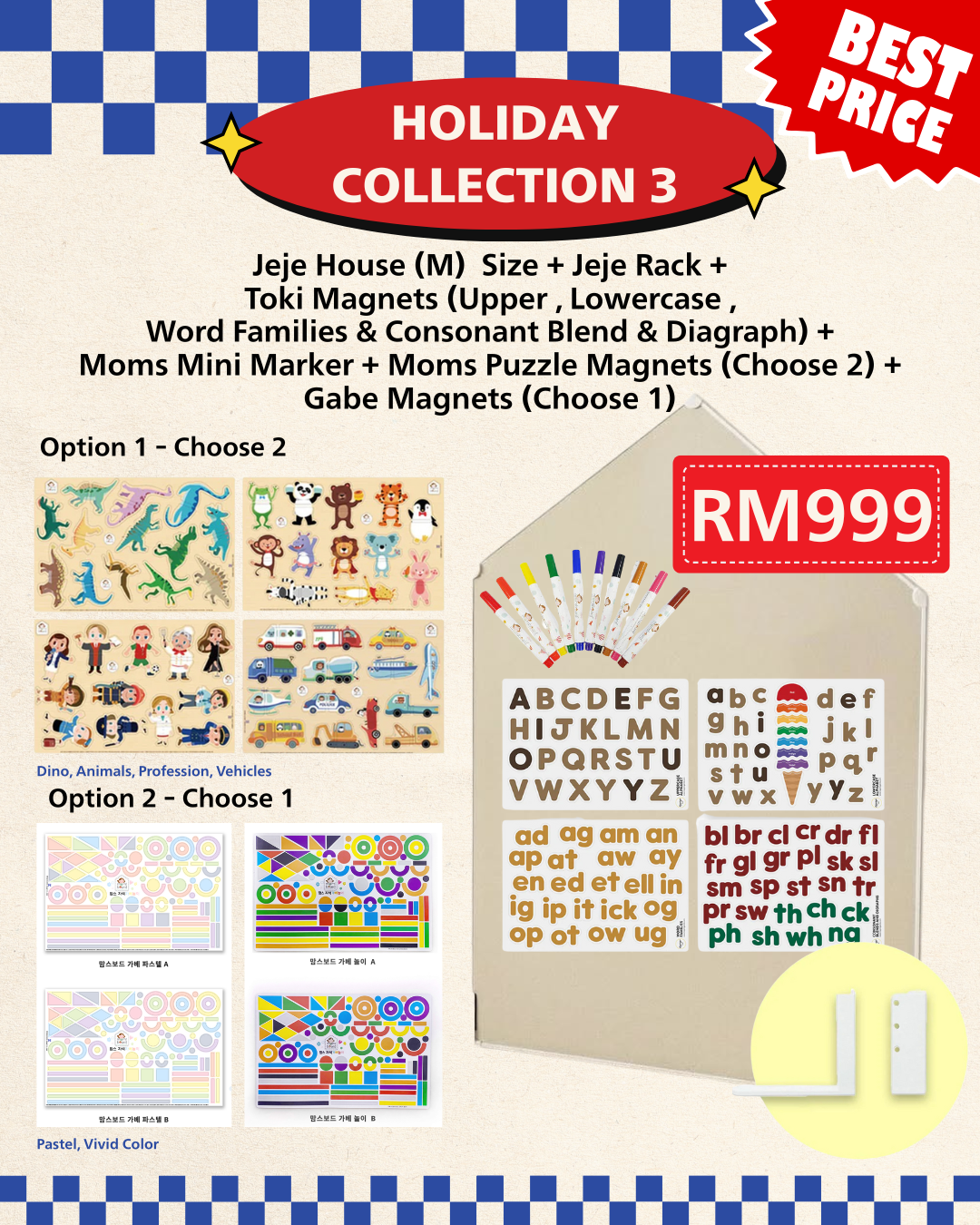 Jeje House (M) Size + Jeje Rack + Toki Magnets (Upper , Lowercase , Word Families & Consonant Blend & Diagraph) + Moms Mini Marker + Moms Puzzle Magnets (Choose 2) + Gabe Magnets (Choose 1)